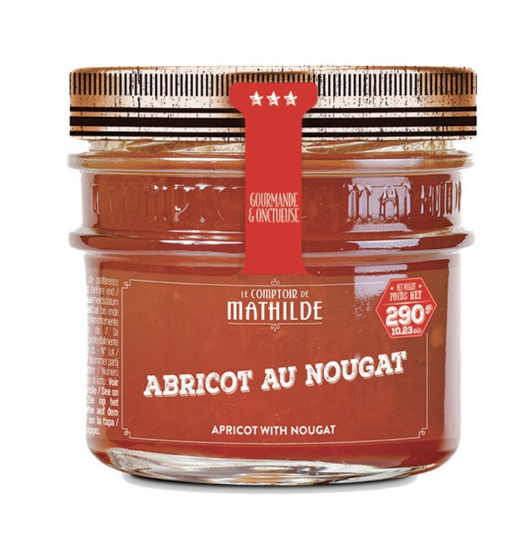 Zutaten : 49% Aprikose, Rohrzucker, 2% Nougat-Chips mit Kakaobutter beschichtet (MANDELN, Zucker, Glukosesirup, Honig, Kakaobutter, EIWEISS, ungesäuertes Brot (Kartoffelstärke, Wasser), natürliches Vanillearoma).